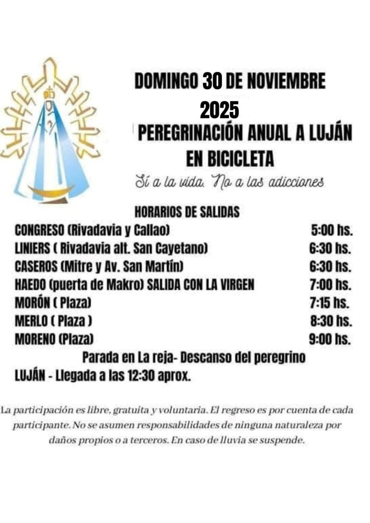 Este evento sin fines de lucro, que fue declarado de Interés provincial en el 2022 (con apoyo provincial desde 2024), convoca a miles de peregrinos, en dos columnas organizadas: una que sale de la Plaza Grigera de Lomas de Zamora a las 5AM, a cargo de Carlos Bakus; y otra que parte desde el Congreso nacional a la misma hora, cargo de Federico Calvo y otros colaboradores que guían a los ciclistas hasta Haedo. Desde allí parte (a las 7AM) la caravana con los Bomberos voluntarios de Morón llevando la imagen de la Virgen de Luján, a cargo de Raquel Laudani.