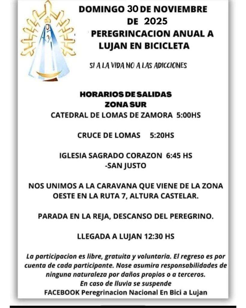 Si bien cada domingo Luján recibe la visita de numerosos grupos (Desde Varela, Chascomús, Cañuelas) ésta en especial es la que convoca a más ciclistas en todo el año, con el único espíritu de poder «converger en unión y fraternidad». Y en este año bajo la consigna «Sí a la vida, no a las adicciones».