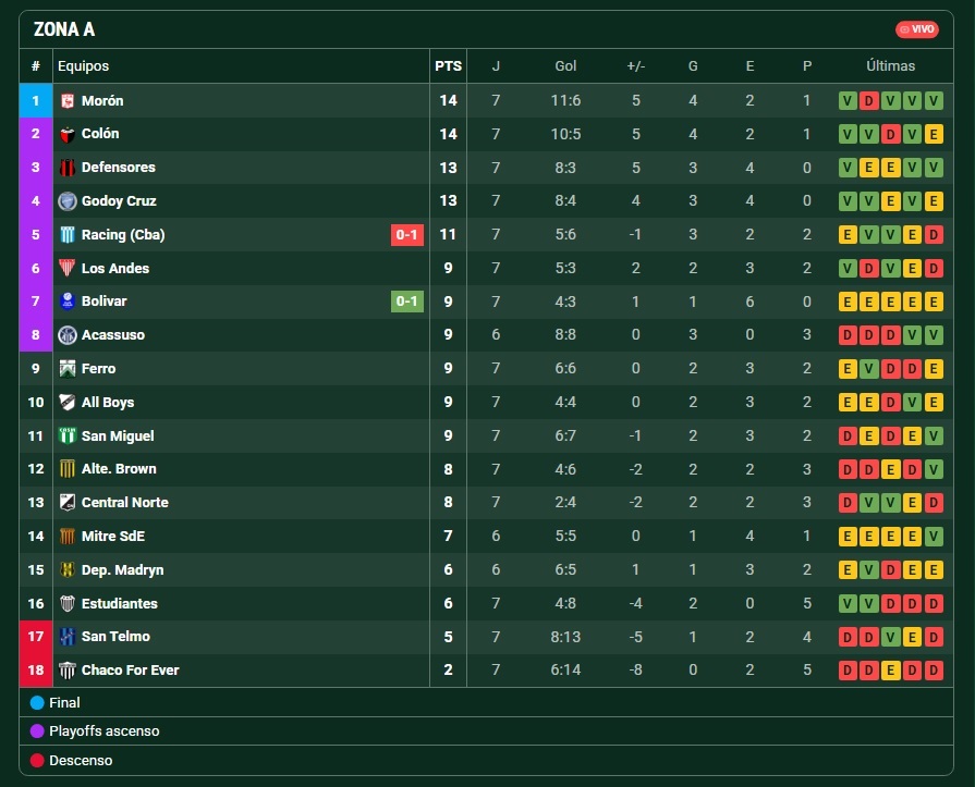 Con este resultado, el equipo de Walter Otta recuperó el liderazgo de la Zona A: Morón suma 14 puntos, ubicándose primero por diferencia de gol; mientras que San Telmo tiene 5 y está en la 17° posición en la tabla.