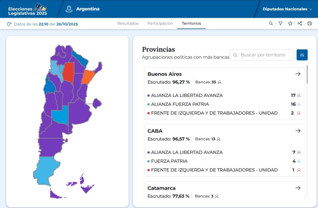 La Libertad Avanza logró una amplia victoria en la elección legislativa, con 40,84% de los votos, en el debut de la Boleta Única Papel a nivel nacional. El resultado más impactante se dio en la Provincia de Buenos Aires, donde el gobierno, con Diego Santilli, dio vuelta la elección provincial de septiembre (perdió por 13 puntos) para sacar casi un punto de ventaja sobre la lista de diputados nacionales de Fuerza Patria, que encabezaba el ex canciller Jorge Taiana.