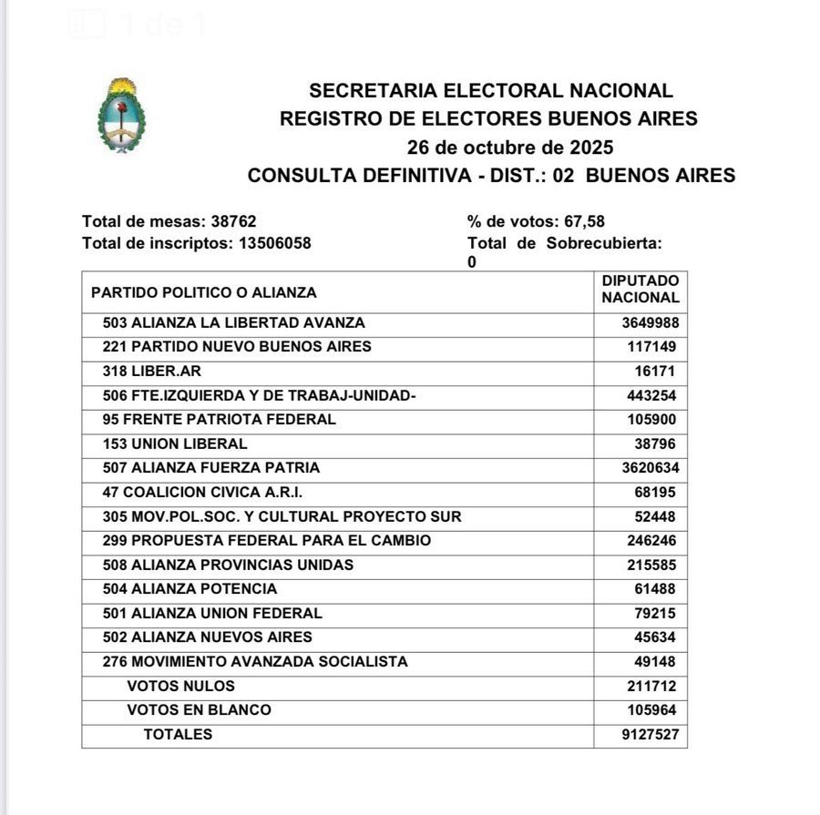 La Libertad Avanza (LLA) finalmente se impuso por 29.354 votos de diferencia sobre Fuerza Patria, tras darse a conocer este martes el resultado del escrutinio definitivo de las elecciones legislativas nacionales, llevadas a cabo el pasado 26 de octubre.