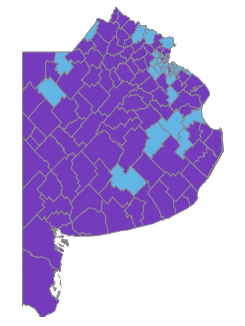 La Libertad Avanza reflejó el gran triunfo en territorio bonaerense con el detalle de haberse impuesto en 99 de los 135 distritos provinciales, por lo que tiñó de violeta gran parte del mapa.
