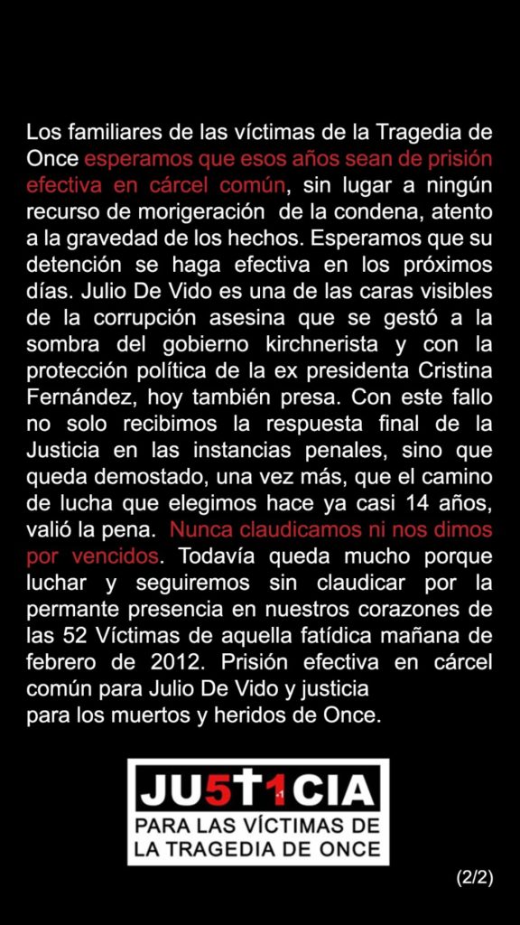 En esa sentencia se subrayó, no obstante, que el Ministerio de Planificación no controló el destino del dinero a pesar de que informes públicos alertaron sobre el mal funcionamiento de los trenes. La Cámara Federal de Casación Penal confirmó la condena y la defensa apeló ante la Corte Suprema.